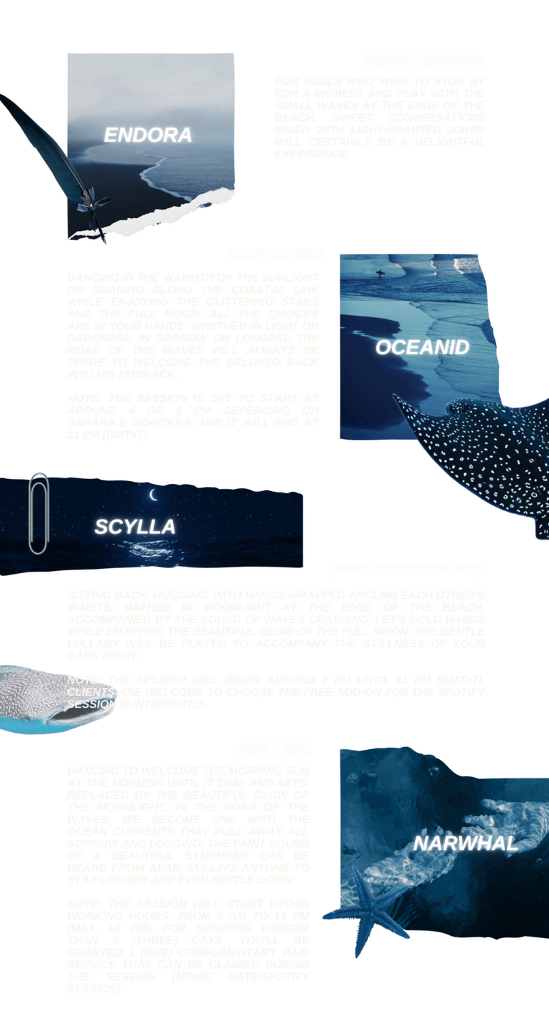 In his embrace, you'll find solace, as he gently wash away all your worries, leaving them to dissolve amidst the frothy embrace of the waves. His touch, like the gentle caress of the ocean breeze. It will ease the burdens you carry, offering you a moment of respite from the weight of the world. Let go of all your burdens and worries and let the rhythm of the waves carry us away into the serenity of the sea. Feel the splashes of water as our feet meet, our laughter echoing in the air along with the dampness of our bodies startled by my seawater. With each step we take, let us leave behind the troubles of the world and immerse ourselves in the beauty of this moment.Even so, as a lover, Sagara exudes a captivating blend of gentleness and mystery upon our first encounters. Yet, once enveloped in his embrace and touched by his kisses, he unveils himself as an irresistibly affectionate and charming sweet talker. He's someone who enjoys paying attention to the small details about his partner, as he believes they are the sweetest things in a relationship. He also has a sweet, old-fashioned sense of humor and enjoys playfully teasing affectionately while sharing laughter-filled moments together.In the family, he was born as the eldest child and possesses a caring and compassionate nature towards the younger ones. His mature demeanor and wisdom in life make him a wonderful listener, able to offer guidance and enlightenment to both siblings and friends alike. You can pour out your heart to him. He will patiently listen to each and every concern attentively.You'll be safe with him. Are you ready to ride the waves and dive into the depths with him, Dear?
