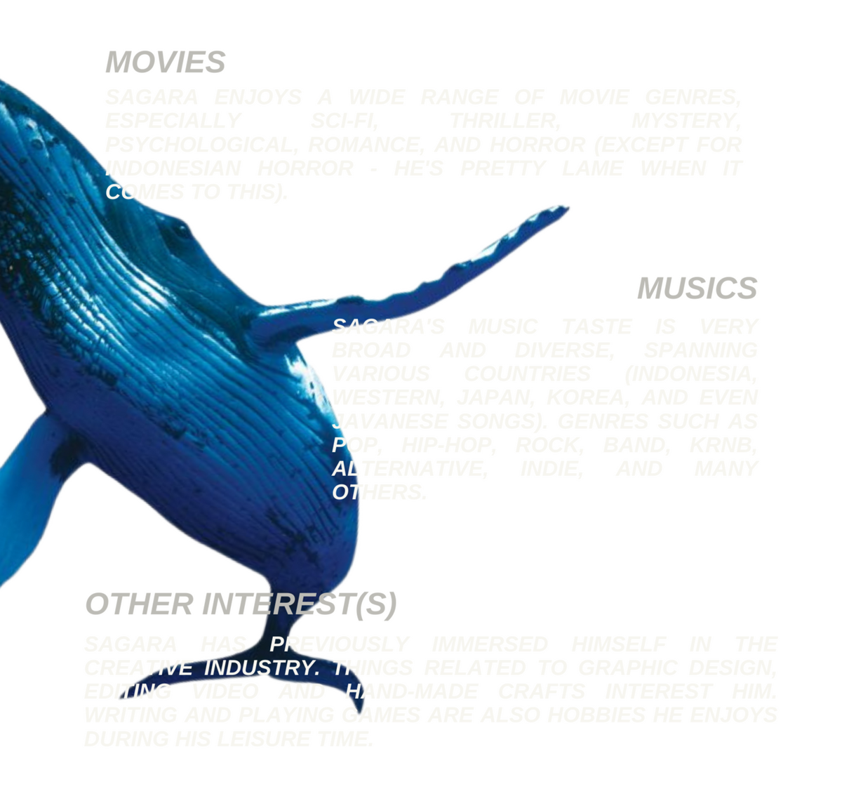 Born into this world amidst the gentle lapping of waves sweeping along the coastline, under the radiant full moon, he, goes by the name Banyu Sagara Kidul; the Southern Sea. Like the roaring waves on the southern sea, he possesses a personality that is both calming and mysterious. His demeanor is gentle yet filled with strong determination. The whispers of the wind that accompany him will chase away all the darkness in your mind, while the sounds of the waves crashing in harmony resonate the rhythm of your story.